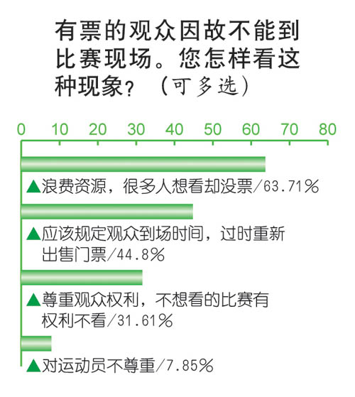 截止到今天21时,本报社调中心通过新浪网对2920名网友完成了调查,结果发现,63.7%的人感叹有票不看比赛简直是“浪费资源”。44.8%的网友认为,应规定观众最迟到场时间,过时应重新出售门票。
