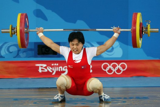 8月12日,朝鲜选手朴贤淑在北京奥运会女子举重63公斤级比赛中。