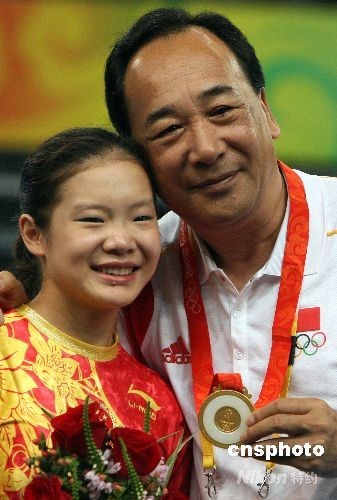 中国女子体操队领军人物程菲,将金牌献给中国体操管理中心主任高健共同分享胜利的喜悦。中新社发 任晨鸣 摄