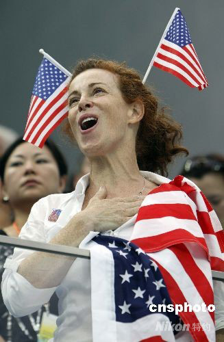 8月13日,一名美国观众和美国游泳队一起高唱国歌庆祝胜利。当日,美国队在北京奥运会男子4x200米自由泳接力项目上,夺得金牌并刷新世界纪录,美国运动员在“水立方”屡获佳绩,也成为美国观众最幸福的地方。中新社发 杜洋 摄