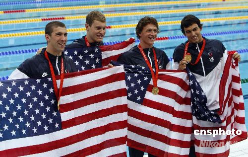 8月13日,美国游泳队在“水立方”举行的北京奥运会男子4x200米自由泳接力比赛中,以6分58秒56的成绩打破他们保持的7分03秒24的世界纪录,并夺得金牌。中新社发 杜洋 摄