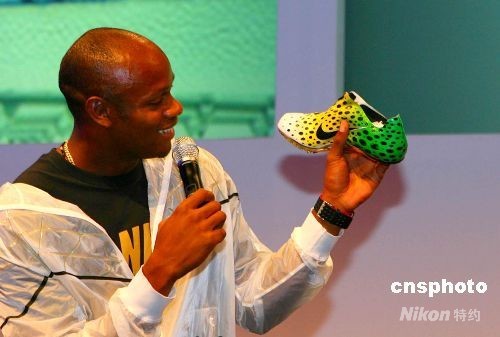 8月12日夜,世界短跑名将鲍威尔在北京发布强力短跑钉鞋,鲍威尔本人参与该跑鞋的设计过程。图为他在展示该跑鞋。中新社发 沈晨 摄