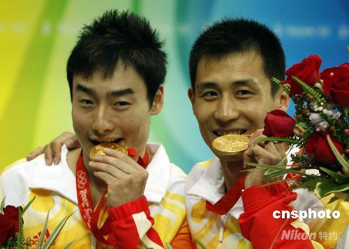 8月13日下午,北京奥运会男子双人三米板决赛在国家游泳中心进行,最终中国选手王峰/秦凯以总分469.08分将这枚金牌收入囊中。这是中国跳水“梦之队”在北京奥运会上获得的第4枚金牌,也是中国代表团在本届奥运会上获得的第16金。俄罗斯“跳水沙皇”萨乌丁和搭档库纳科夫以总分421.98分获得亚军,铜牌被乌克兰选手克瓦沙/普雷格罗夫摘得,成绩是415.05分。图为获奖后的王峰、秦凯在笑品冠军滋味。 中新社发 杜洋 摄