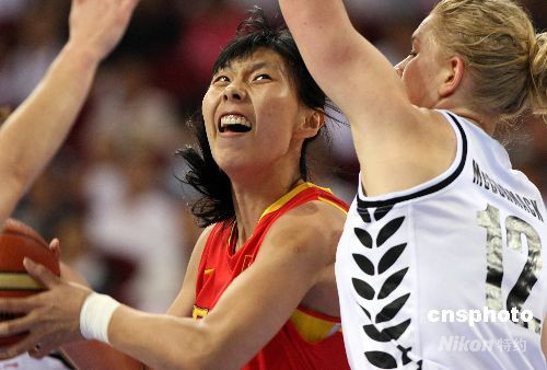 8月13日下午,中国女篮在北京奥运会篮球小组赛第三轮的关键比赛中以80比63战胜新西兰队,小组出线已成定局。队中身高1.97米的中锋陈楠得到全场最高的26分。中新社发 任晨鸣 摄