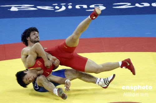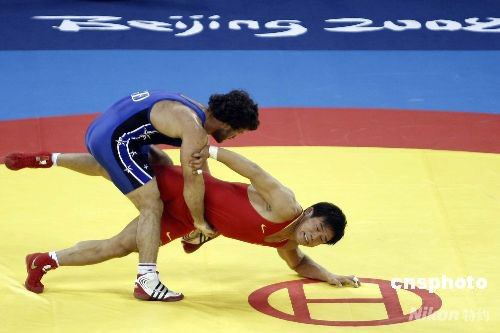 8月13日,北京奥运会摔跤男子古典式74公斤级冠亚军决赛中,中国选手常永祥(红)不敌格鲁吉亚选手马努恰尔·克维克利亚,获得银牌。这枚银牌也创造了中国男子摔跤队在奥运会比赛的最佳成绩。 中新社发 盛佳鹏 摄