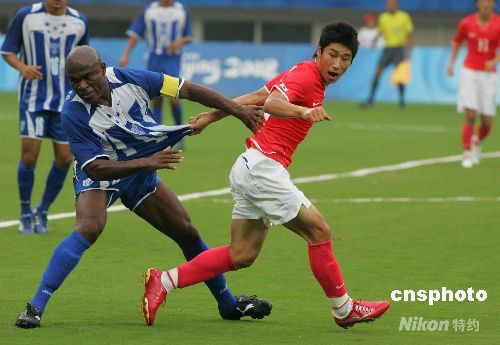 8月13日,北京奥运会男足小组赛,韩国VS洪都拉斯的比赛在上海体育场进行。激烈的比赛使得场上球员在拼抢时的拉扯动作就像“摔跤”高手。 中新社发 汤彦俊 摄