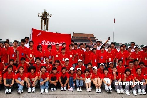 8月13日,北京天安门广场迎来了一个特殊的群体。来自河南郑州的百余名孤儿和来自四川灾区在郑州念书的孤儿们完成了他们的“奥运圆梦之旅”,来到天安门前兴奋的合影留念。中新社发 张双双 摄