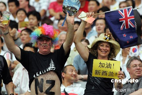 8月13日,北京奥运会男足小组赛,新西兰VS比利时的比赛在上海体育场进行。热情的新西兰球迷打出中文标语为球队加油,成为了场边一道靓丽的风景。 中新社发 汤彦俊 摄