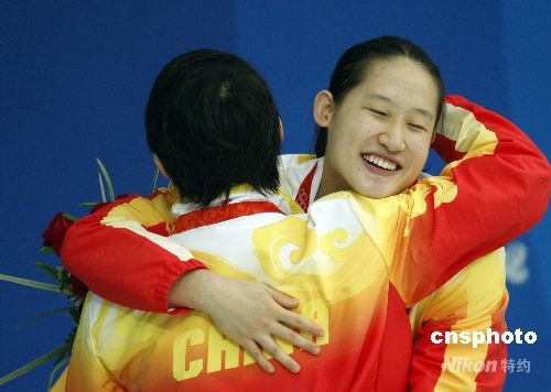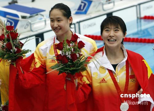 8月14日上午,中国19岁小将刘子歌以2分04秒18打破世界纪录,获得北京奥运会女子200米蝶泳冠军。另一名中国只有18岁的小将焦刘洋夺得亚军。中国泳坛两朵小花双双战胜澳大利亚选手,夺金摘银。 中新社发 杜洋 摄