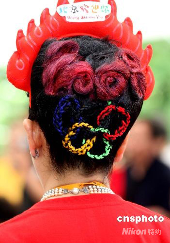 8月14日,青岛奥运帆船赛场,热情观众在展示头带五环的发髻。中新社发 赵振清 摄