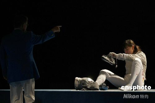 8月14日,北京奥运会女子佩剑团体决赛在国家会议中心击剑馆举行。经过三轮激战,中国队以44 比45一分惜败给黑马乌克兰队,遗憾地获得银牌。激烈比赛中倪红的鞋子脱脚而出。 中新社发 盛佳鹏 摄