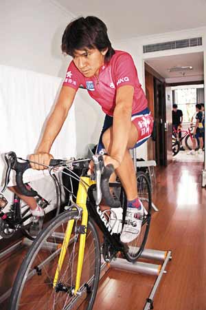 按计划,“阿宝”与黄蕴瑶今天本应进行公路训练,但因天雨以及单车馆内有其它车队正在训练的关系,唯有在室内器械上进行练习。其中“阿宝”边练边反复观看录像带。“他正在看去年‘好运北京’测试赛的录像,16日的比赛,我们打算以测试赛的战术为蓝本,他反复地看,已不知看多少次了。”沈教练解释道。