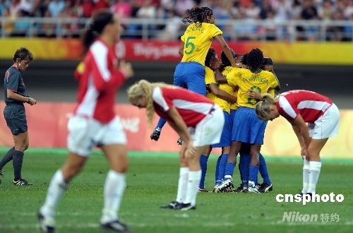 8月15日,奥运女足四分之一决赛在天津奥体中心水滴体育场举行,巴西队2-1击败挪威,率先进入半决赛。本场比赛,巴西队由达妮埃拉和玛塔先入两球,挪威队则由西丽·努尔比通过点球扳回一分,但最终无力挽回败局。