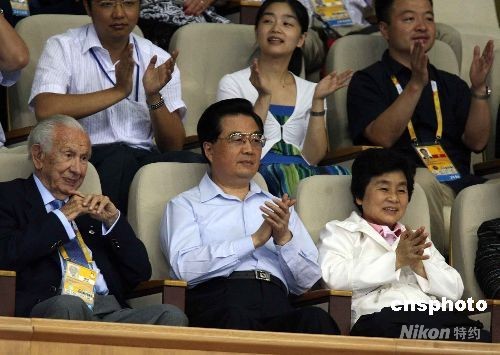 8月15日晚,胡锦涛夫妇与国际奥委会终身名誉主席萨马兰奇等到北京首都体育馆,观看北京奥运会中国与美国女排比赛。中新社发 任晨鸣 摄