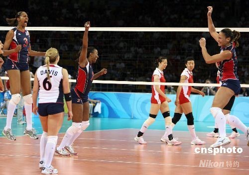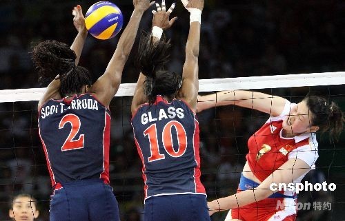 8月15日晚,北京奥运会女排小组赛中国与美国之战在北京奥运会排球比赛馆--首都体育馆举行,这场被戏称为“和平大战”的比赛最后时刻,两名美国选手封死了中国队王一梅的扣杀而以3比2战胜中国女排。中新社发 任晨鸣 摄