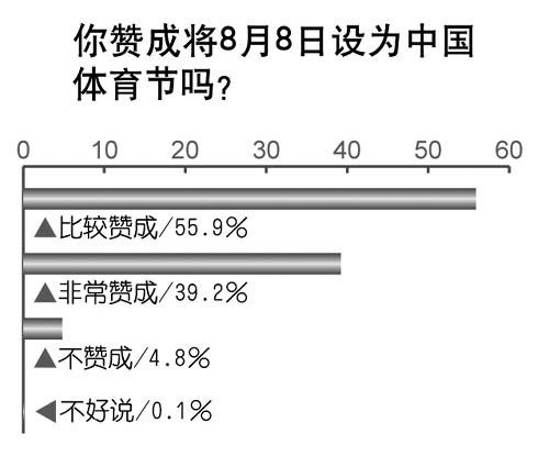 和于波有同样想法的网友占绝大多数。截至15日21时,中国青年报社会调查中心通过搜狐网对1418名网友的在线调查显示,95.1%的人赞成将8月8日设为中国体育节。