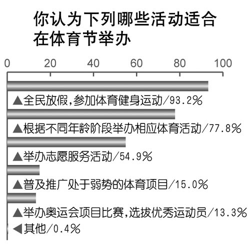调查表明,93.2%的公众表示中国体育节那天应该全民放假,参加体育健身运动,77.8%的公众认为应根据不同年龄阶段举办相应体育活动,54.9%的公众认为应该举办志愿服务活动,15.0%的人觉得要普及推广处于弱势且公众关注度不高的体育项目,还有13.3%的公众认为应该举办奥运会项目比赛,选拔优秀运动员。 (记者王聪聪)