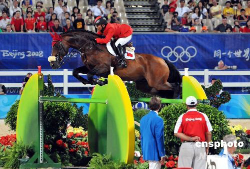 八月十五日晚,奥运马术在香港沙田举行场地障碍个人赛及团体赛的第一轮资格赛。中国选手李振强与坐骑“长安金伯乐”奥运马术场地障碍赛上登场。现年四十岁来自广东东莞的李振强,是首位参加奥运马术障碍赛的中国人。中新社发 邓庆乐 摄