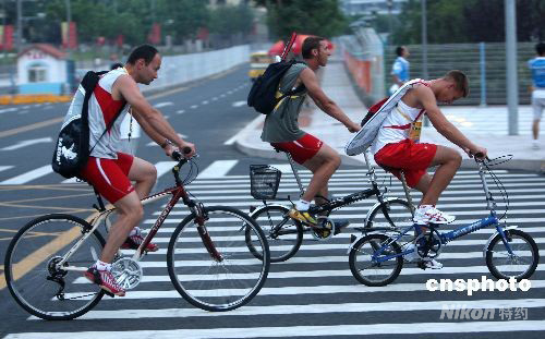 北京2008奥运会青岛分赛场的奥帆村居住着来自世界各地的400多名运动员,许多运动员在比赛之前选择自行车运动为赛前的准备活动,“自行车比赛”场景经常可见。中新社发 赵振清 摄