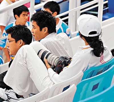 报道说,郭晶晶在第三跳前,霍启刚才于水立方的观众席现身,相隔约一、两分钟后,朱玲玲和霍启山也到场,三人并肩而坐。霍启刚被全场记者举机狂影,表现甚不自然,反而带备Canon专业相机及长镜的朱玲玲则投入其摄影世界,每逢郭晶晶和吴敏霞出场,她都即时举机拍照。