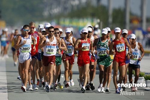 8月16日,北京奥运会田径比赛第二日,在北京国家体育场进行的男子20公里竞走中,俄罗斯选手瓦列里-博尔钦以1时19分01获得该项目金牌。 银牌被厄瓜多尔选手赫费尔松·佩雷斯以1小时19分15获得,铜牌被澳大利亚选手贾里德·塔伦特以1小时19分42秒获得。 中国三名选手王浩、禇亚飞与董吉敏无缘奖牌。中新社发 盛佳鹏 摄