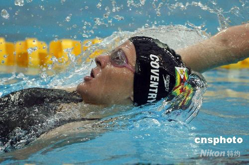 8月16日,在北京奥运会女子200米仰泳决赛中,卫冕冠军、津巴布韦选手科斯蒂·考文垂打破世界纪录并获得冠军,为非洲赢得游泳首金。 中新社发 杜洋 摄