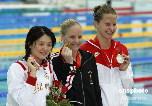 在北京奥运会女子200米仰泳决赛中,卫冕冠军、津巴布韦选手科斯蒂·考文垂(中)打破世界纪录并获得冠军。美国选手霍泽尔和日本选手中村礼子(左)获得银牌和铜牌。