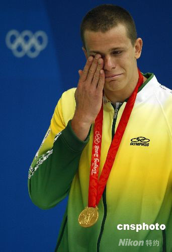 8月16日,游泳决赛最大的冷门是巴西选手小西埃洛在男子50米自由泳决赛中以21秒30的成绩打破了21秒34的奥运会纪录,获得该项目的金牌。这也是巴西在本届奥运会上的第一枚金牌。法国选手勒沃以21秒45获得银牌,另一位法国名将贝尔纳以21秒49获得铜牌。 中新社发 杜洋 摄