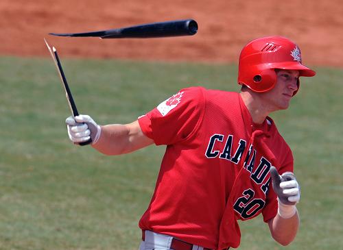 8月16日,加拿大队球员迈克尔·桑德斯在击球时球棒折断。当日,在五棵松棒球场举行的北京奥运会棒球预赛中,美国队以5比4战胜加拿大队。新华社记者张领摄