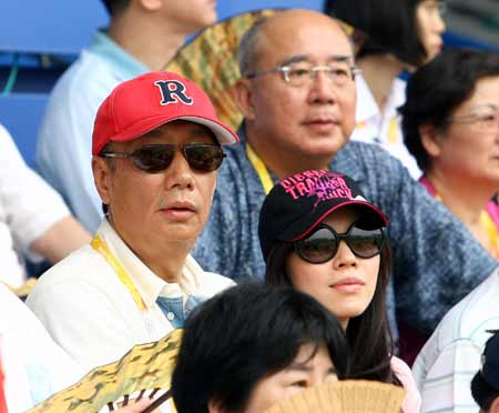 2008北京奥运会棒球赛13日在五棵松体育中心举行中华台北队对荷兰队的揭幕战,鸿海集团董事长郭台铭(左)和妻子曾馨莹也到场看球。(上图)
