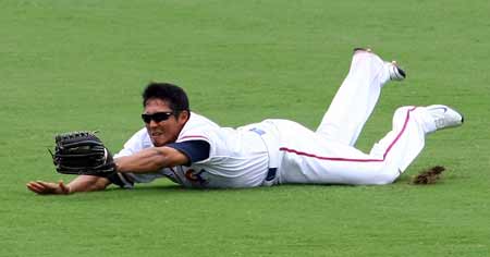 北京奥运棒球赛13日在五棵松体育中心举行中华台北队对荷兰队之战,中华台北队选手林哲瑄一个漂亮的接杀,整个人扑倒在地上。(下图)