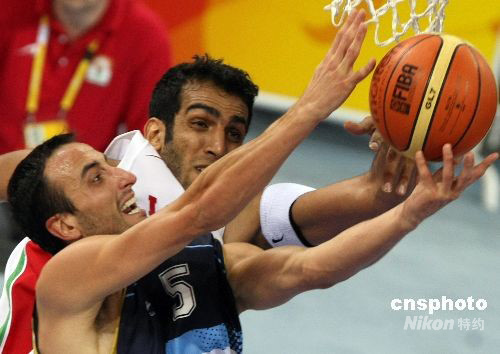 8月16日,北京奥运会男子篮球小组赛第四轮比赛在五棵松篮球馆举行,雅典奥运会冠军阿根廷队以97比82击败亚洲亚军伊朗队,队中“老大”、效力于NBA马刺队的球星吉诺比利砍下全场最高的32分。中新社发 任晨鸣 摄