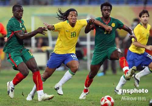 8月16日,北京奥运会沈阳足球分赛场举行男足1/4决赛,巴西队通过加时赛,以2:0战胜喀麦隆队,进入半决赛。图为巴西队球员罗纳尔迪尼奥(左二)带球突破。中新社发 张宇 摄