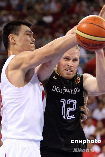 8月16日,北京奥运会男子篮球小组赛第四轮比赛在五棵松篮球馆举行,最终由姚明率领的中国队战胜由诺维斯基、卡曼率领的德国队,挺进8强。中新社发 任晨鸣 摄