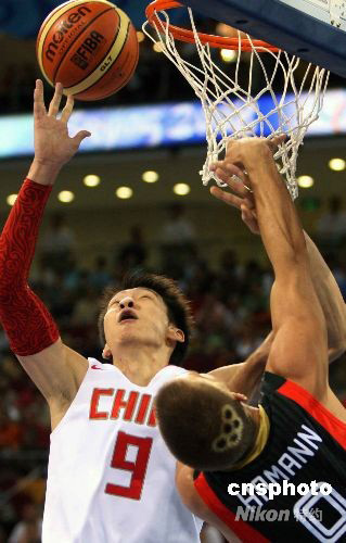 中国队的后卫孙悦严防德国队中锋哈曼的扣篮。