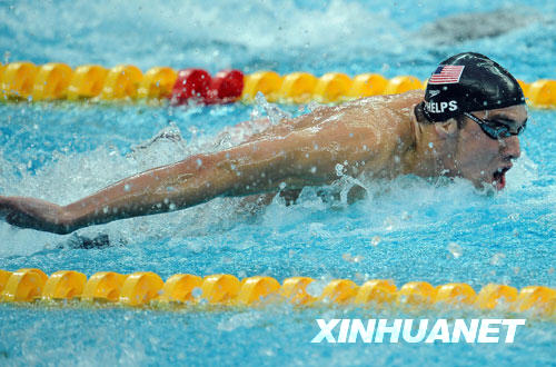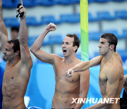 8月17日,菲尔普斯领衔的美国队以3分29秒34的成绩打破世界纪录并夺得金牌。这是菲尔普斯继男子400米个人混合泳、男子4x100米自由泳接力、男子200米自由泳、男子200米蝶泳、男子4x200米自由泳接力、男子200米个人混合泳和男子100米蝶泳之后,收获的第八枚北京奥运会金牌,打破前辈施皮茨在1972年慕尼黑奥运会上创造的一届拿七块金牌的纪录。 新华社记者 陈凯摄