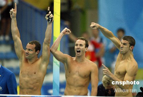 8月17日,美国队获得北京奥运会男子4乘100米混合泳接力冠军,至此,23岁的美国游泳运动员菲尔普斯不仅用8金刷新了单届奥运会金牌纪录,而且还将个人所有奥运会的金牌总数提高到了14枚,达成了他人难以超越的“世界纪录”。 中新社发 杜洋 摄