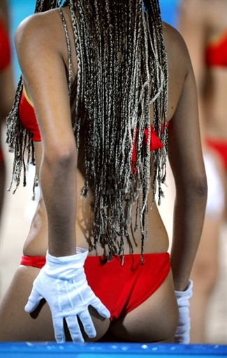 沙排场地上,一个发型前卫的啦啦队员惹火的背影。