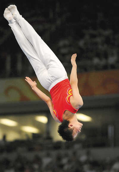 8月16日,北京奥运会蹦床资格赛在国家体育馆进行,力争实现这一项目奥运金牌零突破的中国选手在比赛中显示了强大的实力。