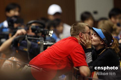 此图为奥运会开赛首日卡特琳娜射落首金后,丈夫埃蒙斯送吻庆祝。
