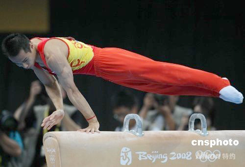 8月17日晚,北京奥运会体操单项决赛在北京奥林匹克公园内的国家体育馆举行,中国的“鞍马王”肖钦获得冠军。中新社发 任晨鸣 摄