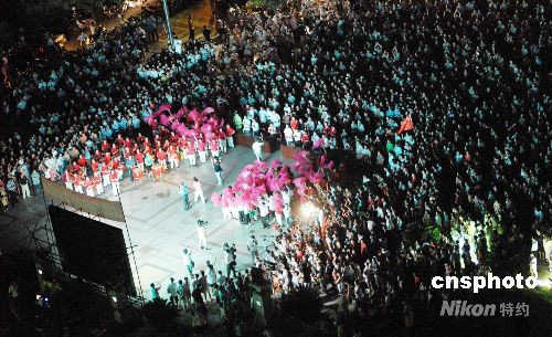 8月17日晚,福建龙岩市上杭县人民广场上人山人海,在当日举行的北京奥运羽毛球男单决赛中,世界排名第一的“超级丹”林丹终于完胜马来西亚名将李宗伟夺冠,圆了自己的奥运金牌梦。中新社发 福建分社 摄