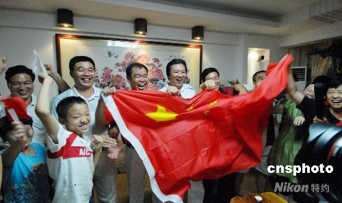 8月17日晚,“超级丹”林丹获得北京奥运羽毛球男单金牌,林丹的父亲林建斌和数十名亲友在福建省龙岩市上杭县家中为其举旗庆贺。中新社发 林福达 摄