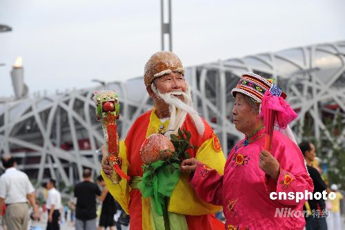 8月16日,北京奥林匹克公园,中国“寿星仙人”“飘临”鸟巢 。中新社发 廖攀 摄