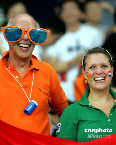 8月16日,北京奥运会男足阿根廷对阵荷兰的比赛在上海体育场进行。一位荷兰球迷带着一副巨型眼镜在比赛现场观看比赛。中新社发 汤彦俊 摄
