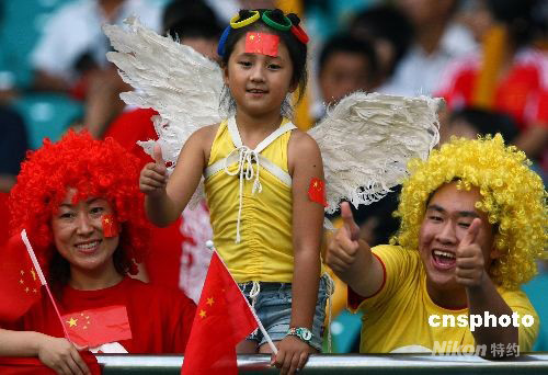 8月13日傍晚,北京奥运会男子足球预赛,中国对巴西的比赛即将在秦皇岛奥体中心举行,观众席一位“小天使”球迷在家长的陪同下前来助阵。中新社发 刘新 摄