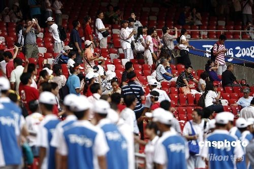 8月18日上午,在北京奥运男子110米栏第1轮第6组比赛中,中国选手刘翔因腿伤遗憾退出比赛。众多特地前来“鸟巢”观看刘翔比赛的观众久久不舍离场。中新社发 盛佳鹏 摄