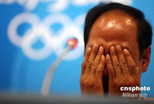 8月18日上午,在北京奥运男子110米栏第1轮第6组比赛中,集十几亿人“宠爱”为一身的中国选手刘翔在第一次起跑后因腿伤遗憾退出比赛。赛后,教练孙海平说道刘翔的伤病与毅力,泣不成声。中新社发 任晨鸣 摄