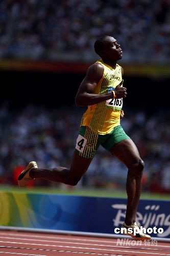 8月18日,北京奥运会男子200米预赛在北京国家体育场“鸟巢”举行,刚拿到奥运百米冠军的牙买加选手博尔特轻松晋级下一轮比赛。 中新社发 盛佳鹏 摄
