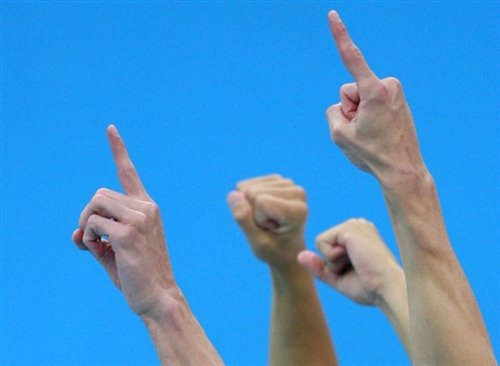菲尔普斯和他的队友们在4×200米自由泳接力摘金后庆祝。